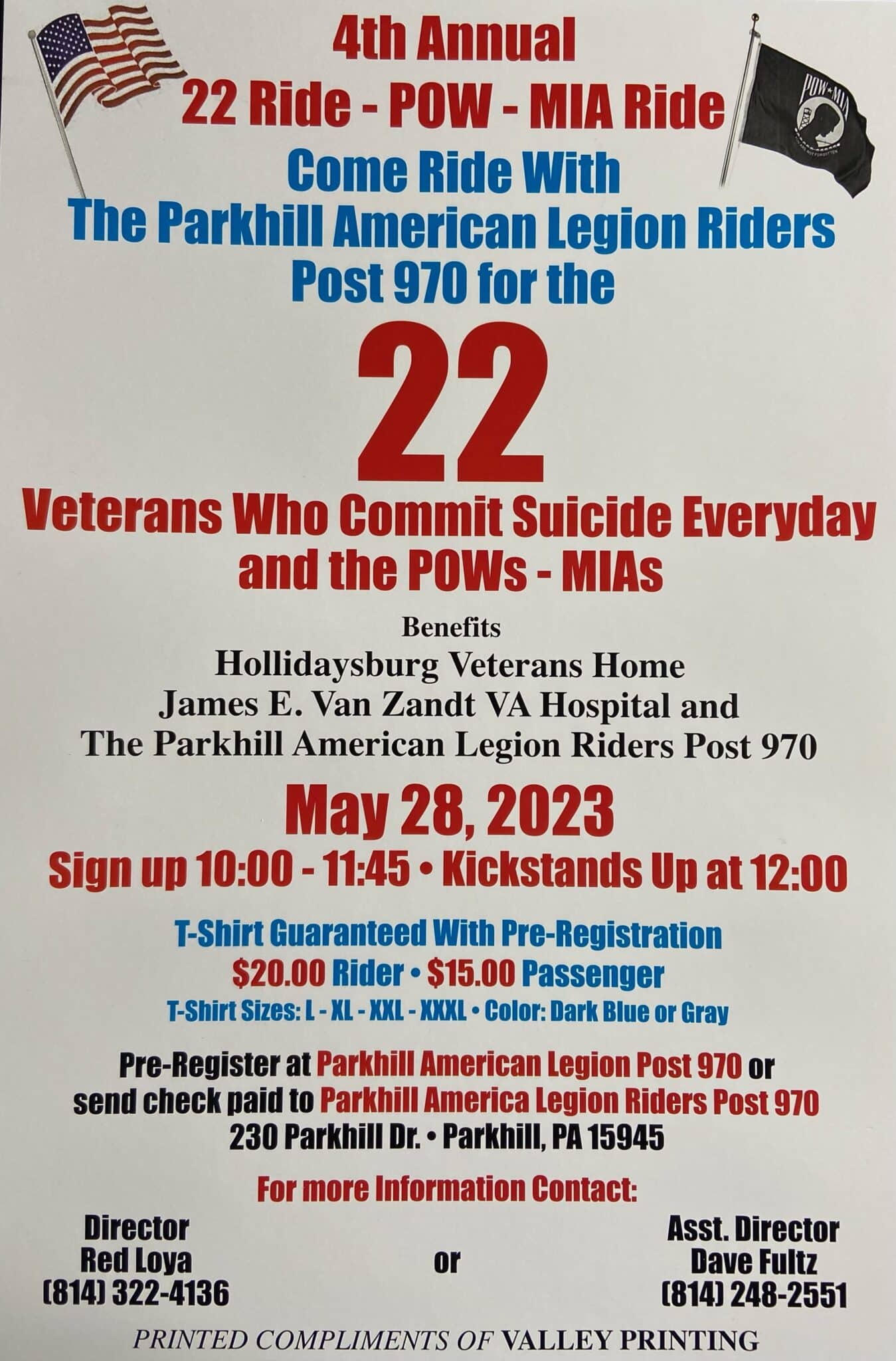 Come ride with the Parkhill American Legion Riders Post 970 for the 22 veterans who commit suicide every day and the POWs - MIAs. This event will benefit the Hollidaysburg Veterans Home, James E Van Zandt VA Hospital and the Parkhill American Legion Riders Post 970.