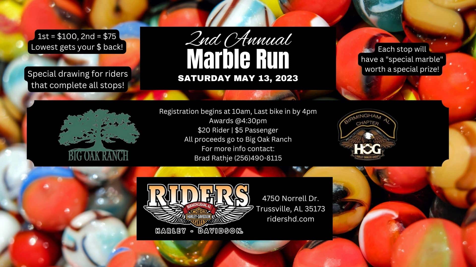 Rev up your engines and get ready for an unforgettable weekend at Annual Marble Run. Roar into Trussville, AL on May 13th, 2023 at Riders Harley Davidson. This motorcycle event promises thrills, excitement, and camaraderie for riders and enthusiasts alike.